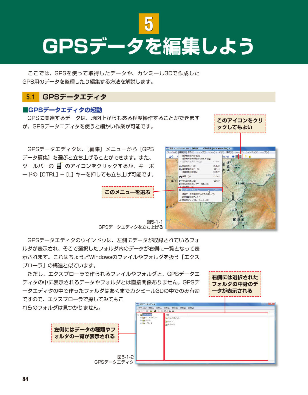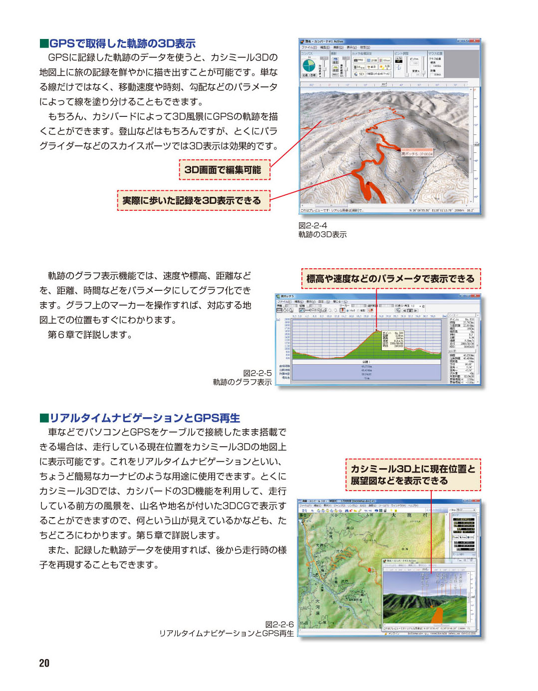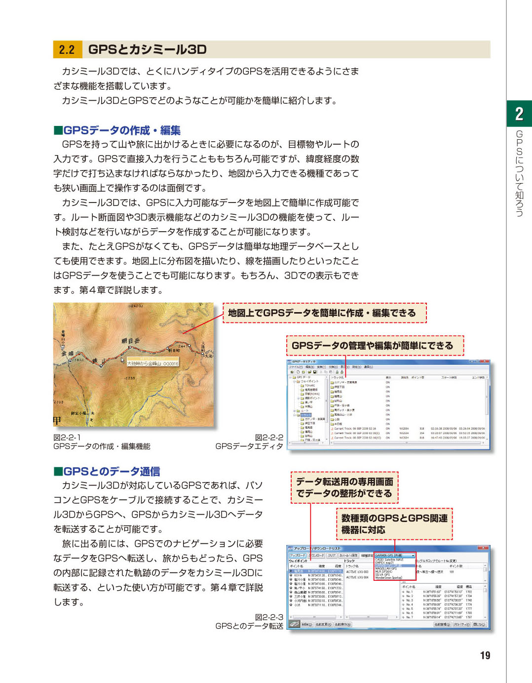 初心者の方でもわかりやすいように図版を多用し、操作手順を丁寧に解説しました。また、つまづきやすいポイントや、すでにカシミール3Dをお使いくださっている方々のヒントになるような事柄も織り交ぜています。