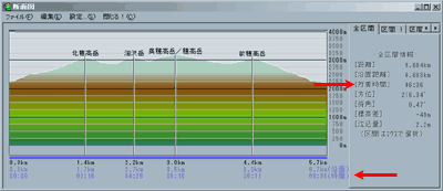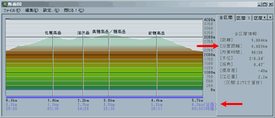 [設定]で平地での速度を設定すると、勾配では自動的に補正してだいたいの所要時間を算出します。主に徒歩を対象にあくまで目安です。 |
