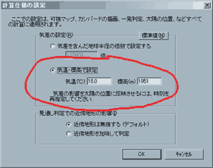 [表示]-[計算仕様の設定]で[気差]の影響の設定を、温度と標高から設定できるようにしました。 標高から気圧の算出は理科年表の式、大気の温度減率(℃/100m)は-0.65を使用。 |