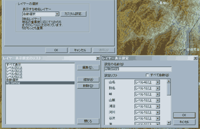 地名表示は5つのレイヤーにより表示できますが、地名の種類毎にどのレイヤーを表示するかをカスタマイズできるようになりました。 [表示]-[表示の設定]で[地名表示]の項目で[カスタム設定]を選ぶと詳細な設定が可能です。 |