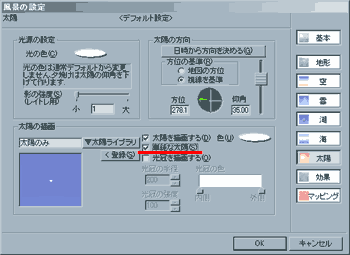 OFFの仕方は、[風景の設定]を開き、各風景を選択します。[地形]で各地形の[素材を編集する]を開き、[材質]の項目で[ハイライト成分]のチェックをはずします。