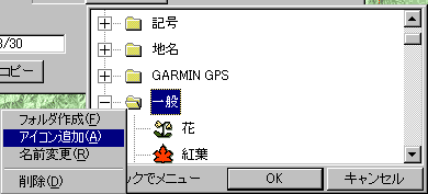 地名とGPSアイコンを統合して、アイコンを種類毎にフォルダ分けしました。自作アイコンを追加する場合は、フォルダを新しく作成できます。 | |