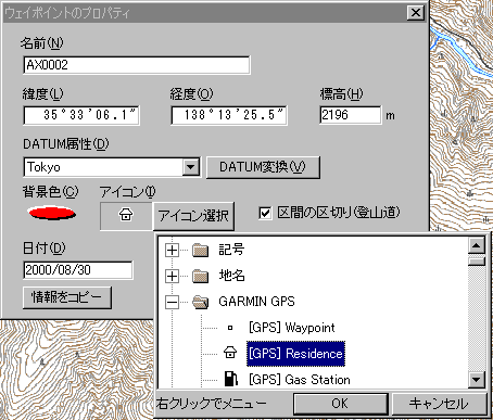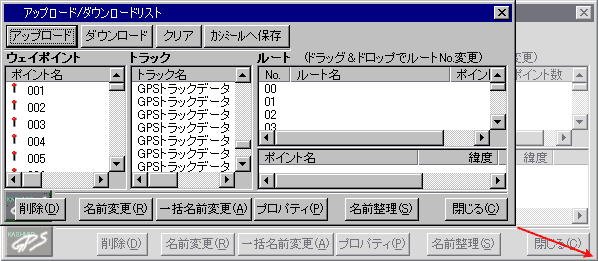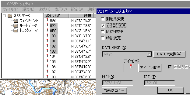 GPSエディタで複数のウェイポイントやトラック、ルートのプロパティを同時に変更できるようになりました。 複数選択は[SHIFT]キーまたは[CTRL]キーを押しながらマウスクリックします。この状態で[編集]-[プロパティ]を選択すると、アイコンや線幅、線種、測地系などが変更できます。 | |