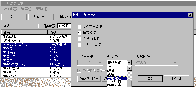 [編集]-[地名の編集]で複数の地名のプロパティを同時に変更できるようになりました。 複数選択は[SHIFT]キーまたは[CTRL]キーを押しながらマウスクリックします。この状態で[編集]-[プロパティ]を選択すると、レベル、種類などが一度に変更できます。 | |