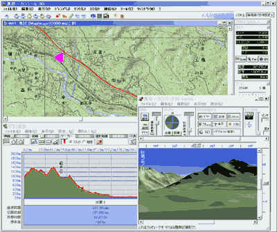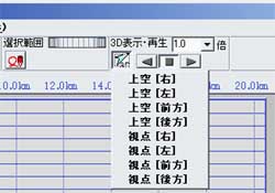 また、時刻情報をもとにしたGPS記録の再生が可能です。従来のGPS再生機能よりもなめらかに、いろいろな視点で再生できます。例えば車窓の風景を再現することもできます。 なお、デフォルト設定では、プレビューのテクスチャを使わない設定になっています。これはグラフウインドウの[設定]-[3D表示・再生]タブで変更できます。テクスチャを使う場合、再生速度を大きくすると重くなります。 | ||||||