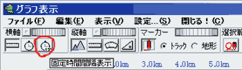 時刻が記載されていないトラックデータ等に等間隔の時間を割り振って表示できるようになりました。 グラフ表示のツールバーで、横軸の[固定時間間隔表示]のボタンを押してください。 時間間隔はデフォルトで10秒に設定されています。変更するには、[設定...]メニューの[軸・目盛り]タブのなかの[時間間隔]を変更してください。 |