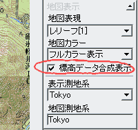 [表示]-[表示の設定]の[地形表現]タブの[標高データと地図画像の合成表示]をチェックしてください。または、右側の[地図表示]パネルの[標高データ合成表示]をチェックします。 |