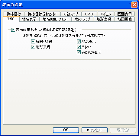 この機能を有効にするには、ファイルについては[ファイル]−[地図と連動して切り替える]のメニューで切り替えたいファイルにチェックを付けてください。表示設定に関しては、[表示]−[表示の設定]の[全般]タブで有効にする項目にチェックを入れます。