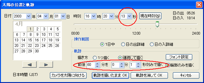 太陽の軌跡で秒単位の指定と軌跡の任意選択を可能にした。