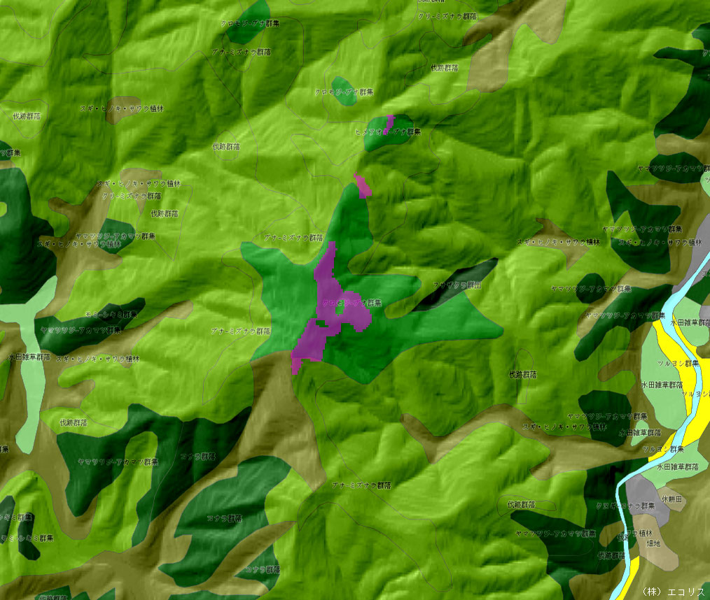 クロモジ−ブナ混在林なので、冬なら落葉して可能性あるか。(エコリス第五回植生図をタイルマッププラグインで使用)