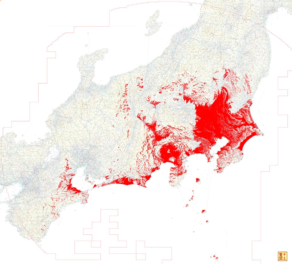 ・富士山の可視マップ画像(50mメッシュ+電子国土) (縮小版) 「この背景地図は電子国土Webシステムから提供されたものである」