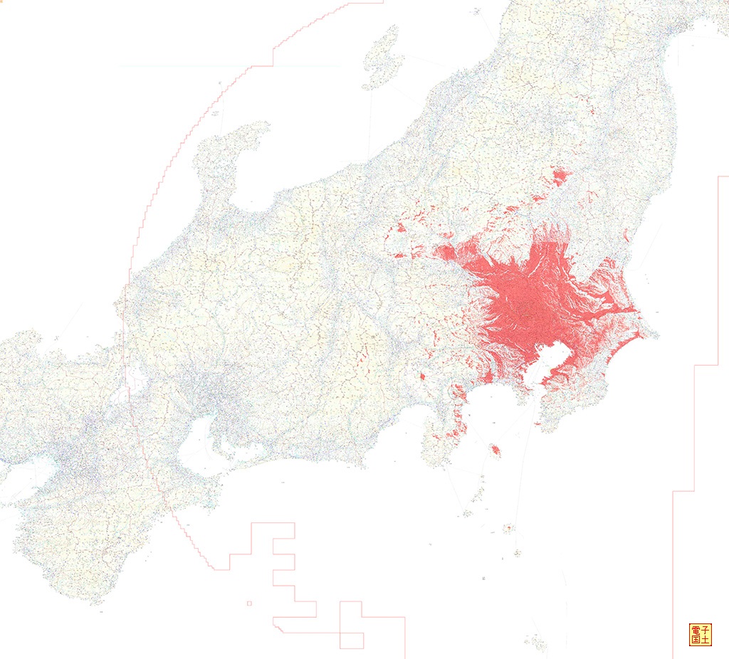 東京スカイツリーの可視マップ画像(最上部 50mメッシュ+電子国土) (縮小版) 「この背景地図は電子国土Webシステムから提供されたものである」