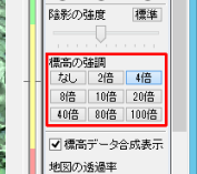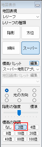 [地図表示]パネルから、[標高の強調]を[2倍]に設定してください。