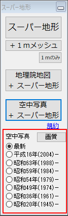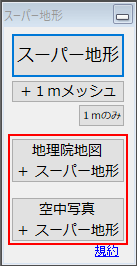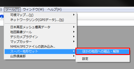 初期状態では、地理院地図と空中写真に、「スーパー地形データ」を組み込んでいますが、解除したい、あるいは解除したものを再度組み込みたい、場合は[ツール]-[スーパー地形]-[他の地図への組み込み・解除]で[組み込み]か[解除]のボタンを押してください。