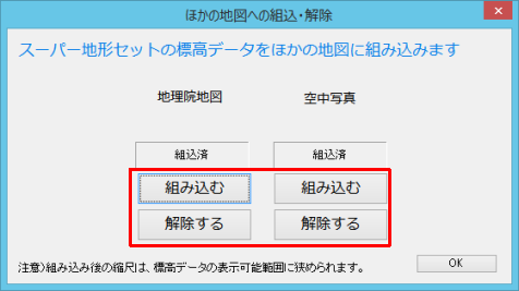 組み込み、解除完了後は[スーパー地形]パネルから、[地理院地図]、[空中写真]のボタンを押して開きなおしてください。