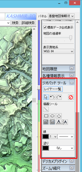 [スーパー地形セット]には[ジオパッドツール]という、地図上に図形や任意の文字を描画できるツールが付属しています。