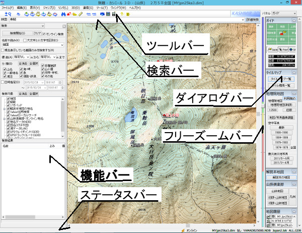 5. 地図を眺める 地図のスクロール 地図の拡大縮小 マークとジャンプ 地図の切り替え 地図の表示設定 地図のウインドウ 縮尺について 断面図について 測定機能 スケールについて 地図を自在に眺めるための機能について解説します。 基本操作とウインドウの説明については、こちらをご覧ください。 [前のページ] [目次] [次のページ]