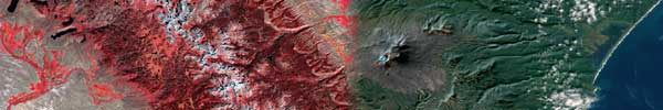 カムチャツカ半島の火山。ETM+画像をSRTM-3に貼り付けた。