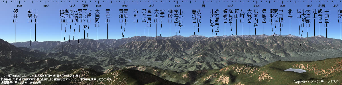 ‖パノラマ描画地点 ■蛾ヶ岳<山梨県> 山頂より 標高1279m+2m 北緯35度30分57秒 東経138度32分20秒 (TOKYO) 蛾ヶ岳(ひるがたけ)は身延線沿線の山。近くの四尾連湖からのハイキングコースが一般的である。富士を見る山としてはもちろんだが、南アルプスの山々を望むにも適している。 ‖望む百名山 ■聖岳 3013m ■赤石岳 3120m ■悪沢岳 3141m ■塩見岳 3047m ■間ノ岳 3189m ■北岳 3192m ■鳳凰山 2840m ‖蛾ヶ岳の情報 削除しました ■カシミール3D http://www.kashmir3d.com/ 地図画像プラグイン Ver2.0a7 をリリースしました。 地図作成時のサイズ制限とチェックを設けたバージョンです。