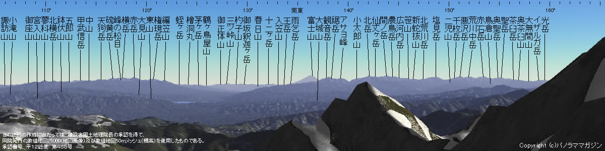 ‖パノラマ描画地点 ■涸沢岳<長野県>山頂より 標高3110m+2m 北緯36度17分34秒 東経137度39分00秒 (TOKYO) 早朝の大気、鮮麗に浮かび上がった富士山と南アルプス。陽が高くなるとこの方面の展望は霞んでくる。 ‖望む百名山(パノラマから) ■蓼科山 2530m ■車山 1925m ■甲武信岳 2475m ■赤岳 2899m ■蛭ヶ岳 1673m ■富士山 3776m ■観音岳 2840m ■甲斐駒ヶ岳 2967m ■北岳 3192m ■仙丈ヶ岳 3033m ■間ノ岳 3189m ■塩見岳 3047m ■悪沢岳 3141m ■赤石岳 3120m ■聖岳 3013m ■光岳 2591m ‖涸沢岳の情報 削除しました ■カシミール3D http://www.kashmir3d.com/ 地図画像プラグイン Ver2.0a7 をリリースしました。 地図作成時のサイズ制限とチェックを設けたバージョンです。