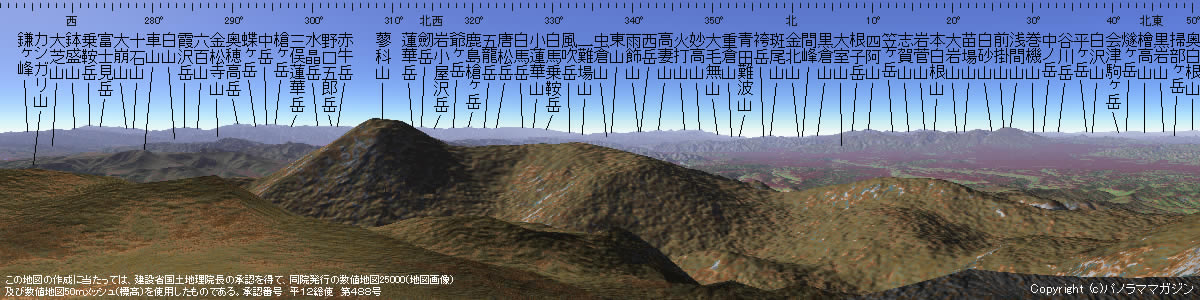 ‖パノラマ描画地点 ■北横岳<長野県>山頂より 標高2480m+2m 北緯36度05分03秒 東経138度19分24秒 (TOKYO) ロープウェイで手軽に登れる北横岳からは、富士山型の蓼科山とその背後に北アルプスの展望が広がっている。 ‖北横岳から見える百名山(遠望10位) ■筑波山 860m 160.7km 83.9度 ■会津駒ヶ岳 2133m 141.1km 40.6度 ■燧ヶ岳 2356m 129.4km 41.6度 ■男体山 2484m 129.1km 54.0度 ■平ヶ岳 2141m 126.9km 36.6度 ■奥白根山 2578m 123.2km 49.8度 ■至仏山 2228m 118.4km 39.9度 ■巻機山 2967m 114.4km 30.0度 ■皇海山 2144m 113.1km 53.4度 ■武尊山 2158m 107.9km 42.1度 ‖北横岳の情報 削除しました ■カシミール3D http://www.kashmir3d.com/ カシミール3D Ver6.30a をリリースしました。 ・地名の入力支援リストにウェイポイントも追加。