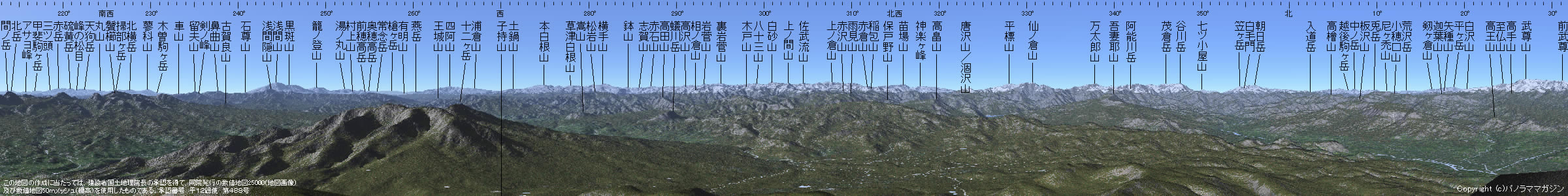 ‖子持山の情報 削除しました ■カシミール3D Ver7.25 へアップ Ver7.25 にアップデートしました。 http://www.kashmir3d.com/ ■パノラマガイドが出ました! このパノマガと同じパノラマをさらに高解像で描いたパノラマガイドが本になりました。 詳しくは下記もご覧ください。 http://www.kashmir3d.com/books/cyoten/ ---------------------------------------- 超展望の山々 -ぐるっとパノラマ関東甲信越 ブルガイドハイカー24 オールカラー 310頁 2002/2/1発売 本体価格:1900円+税 ISBN 4-408-00144-9 実業之日本社 刊 ----------------------------------------