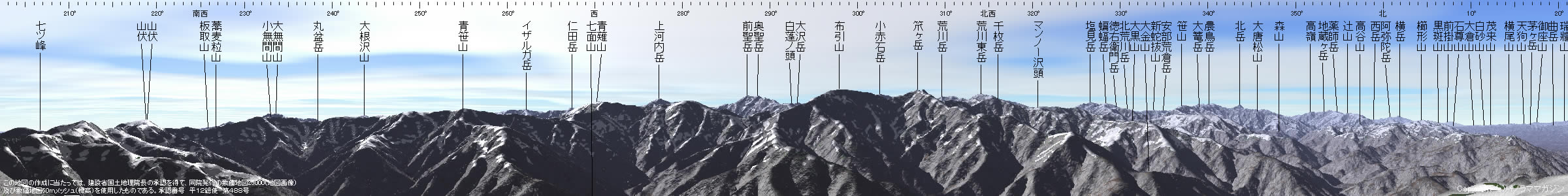 ‖パノラマ描画地点 ■七面山<南ア・山梨> 山頂より 標高1989m+2m 北緯35度21分58秒 東経138度21分07秒 (TOKYO) 山梨県南部、南アルプスの前衛に位置する七面山は、身延山ととも に日蓮宗の信仰の山として知られる山である。山中には随所に寺院が ある。山頂は木立が多い広い原となっているので、抜群の展望とはい えないが、南アルプス方面を望むことができる。また途中、富士山な どもきれいに望め、ダイヤモンド富士も見ることが可能である。 ‖七面山から見える百名山(遠望10位)