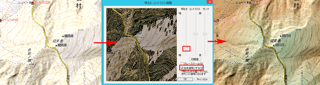 A.「地図画像調整」ボタンを押して画像調整ができます。 Q.標高データ(タイル標高やその他)と組み合わせた場合に、文字や等高線のみをレリーフの上に表示したい。地色の白色は消したい。