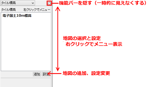 メニューから[ツール]-[タイルマップ]-[タイル標高一覧]を選択しても表示できます。