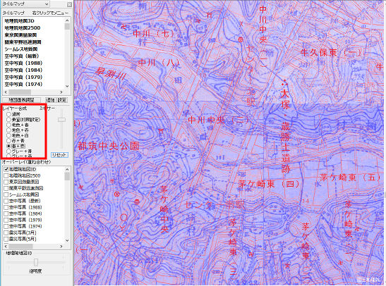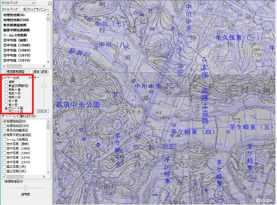 - オーバーレイを使用するには、オーバーレイのリストから重ねたい地図のチェックマークを付けます。