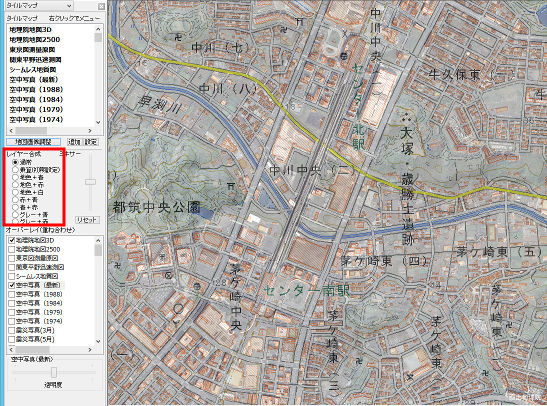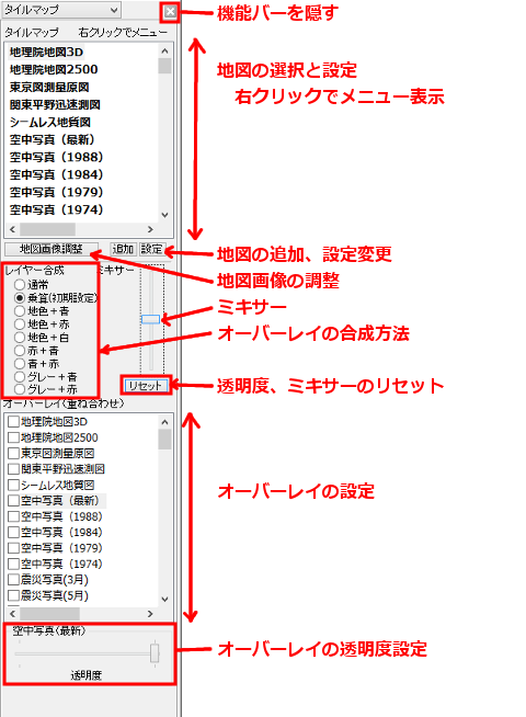背景が明るい地図に使うとオーバーレイがはっきり浮かび上がります。ミキサーを使用して見やすさを調整することができます。背景が暗い場合は[地図画像調整]で調整可能です。