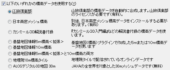 - 「標高データを使用する」にチェックを付けた場合は、その下のいずれかの標高データを自動的に使用するように設定します。