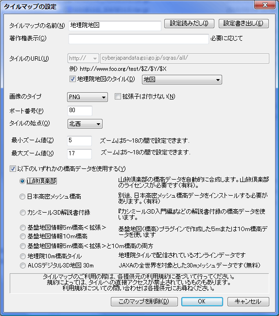 - 「タイルのURL」にはタイルマップの提供元が指定したURLを入力します。