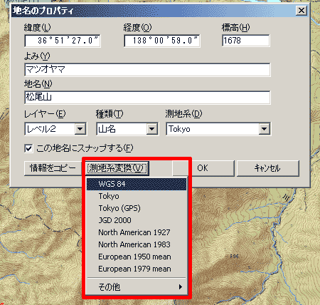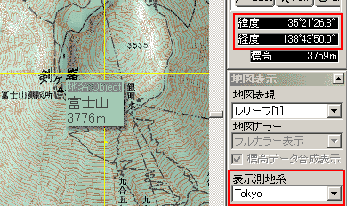 通常、カシミールではマウス位置の緯度経度や、データ入力時の測地系は、従来の日本測地系(TOKYO)に設定してあります。