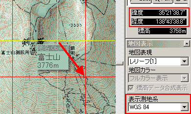 カシミールでは、測地系の異なったデータを混在して使用することができます。世界測地系の富士山の位置も、日本測地系の富士山の位置も、同じ富士山山頂を示してくれます。